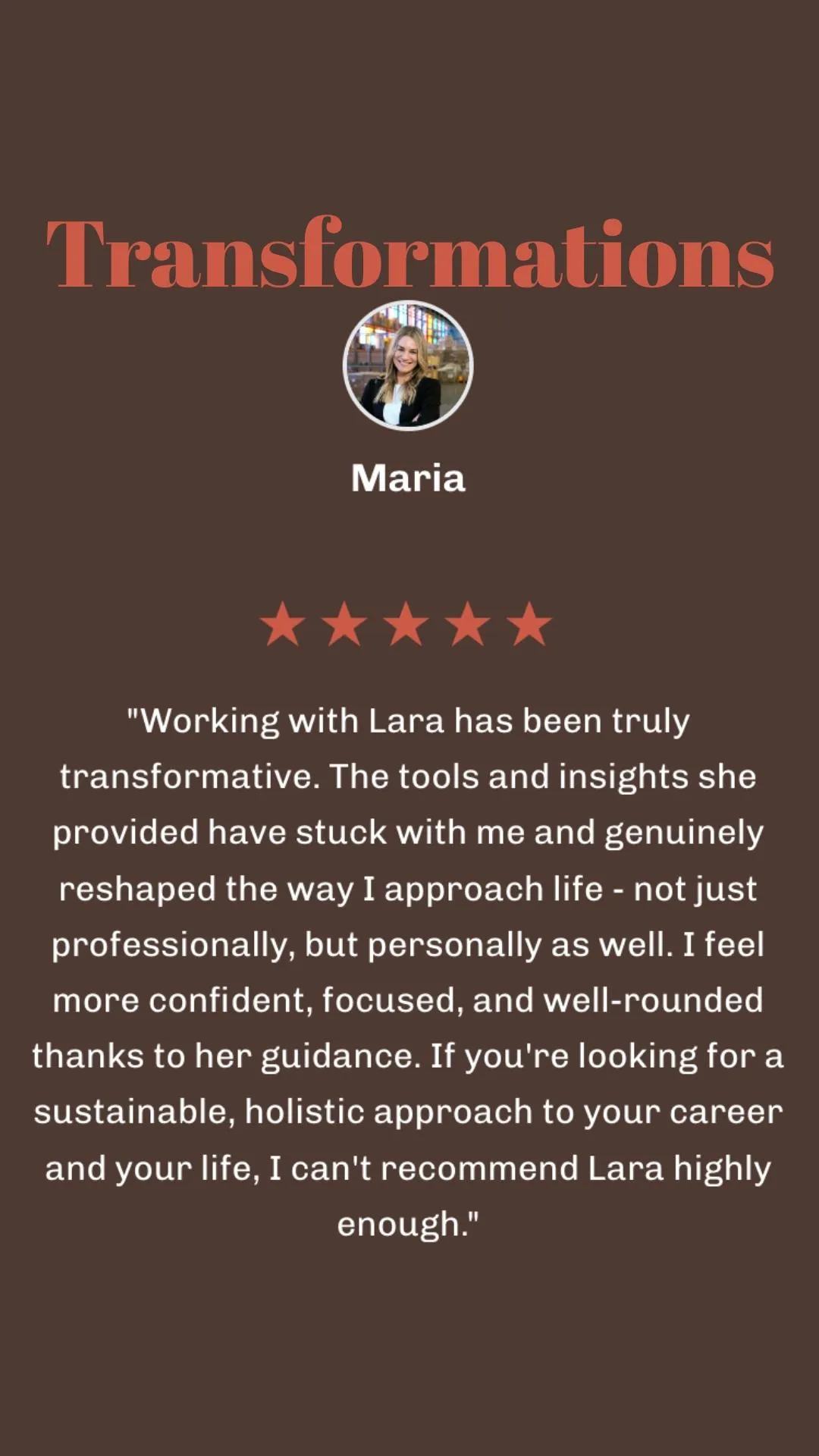 "Working with Lara has been truly transformative. The tools and insights she provided have stuck with me and genuinely reshaped the way I approach life - not just professionally, but personally as well. I feel more confident, focused, and well-rounded thanks to her guidance. If you're looking for a sustainable, holistic approach to your career and your life, I can't recommend Lara highly enough."