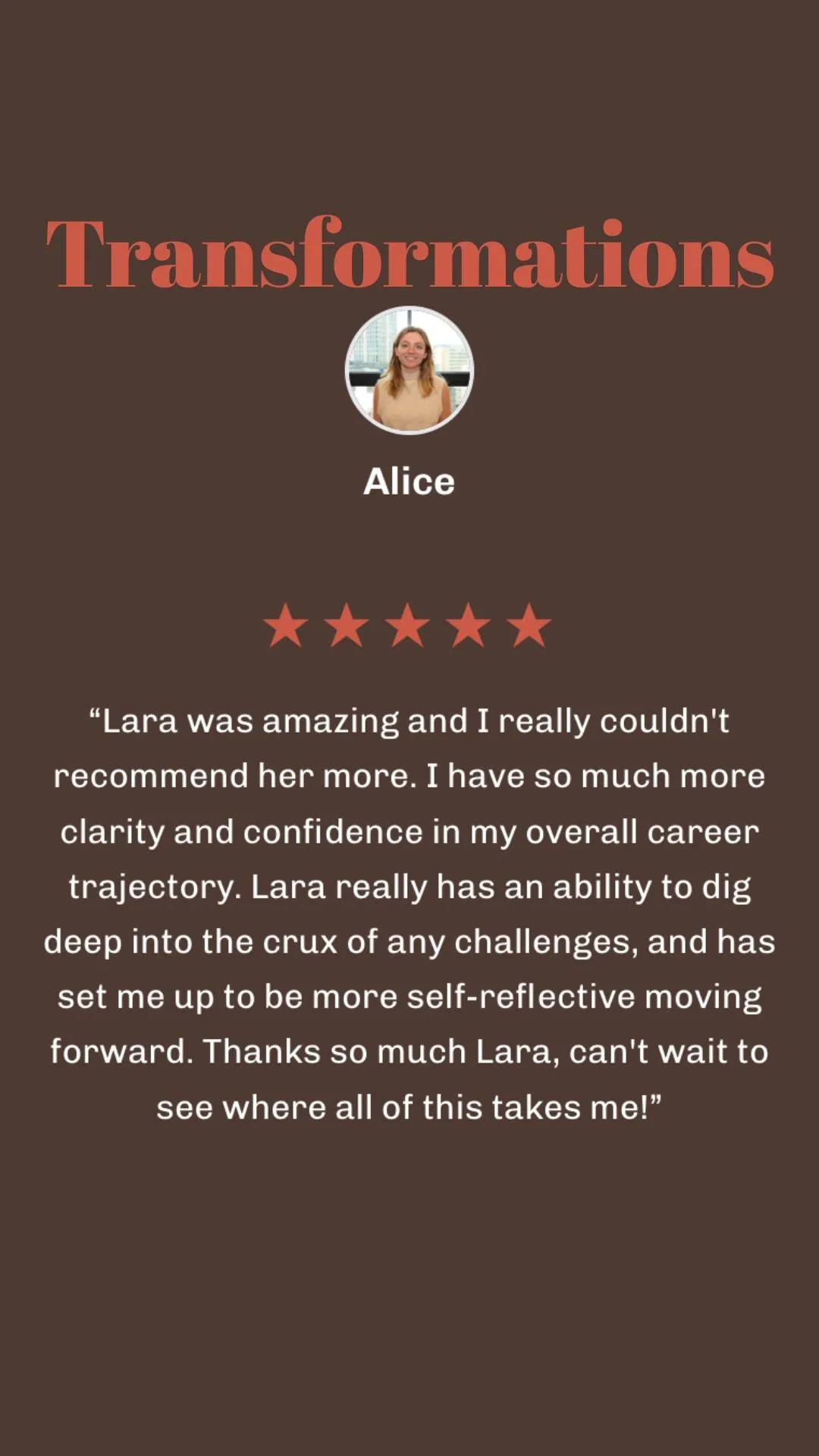 “Lara was amazing and I really couldn't recommend her more. I have so much more clarity and confidence in my overall career trajectory. Lara really has an ability to dig deep into the crux of any challenges, and has set me up to be more self-reflective moving forward. Thanks so much Lara, can't wait to see where all of this takes me!”