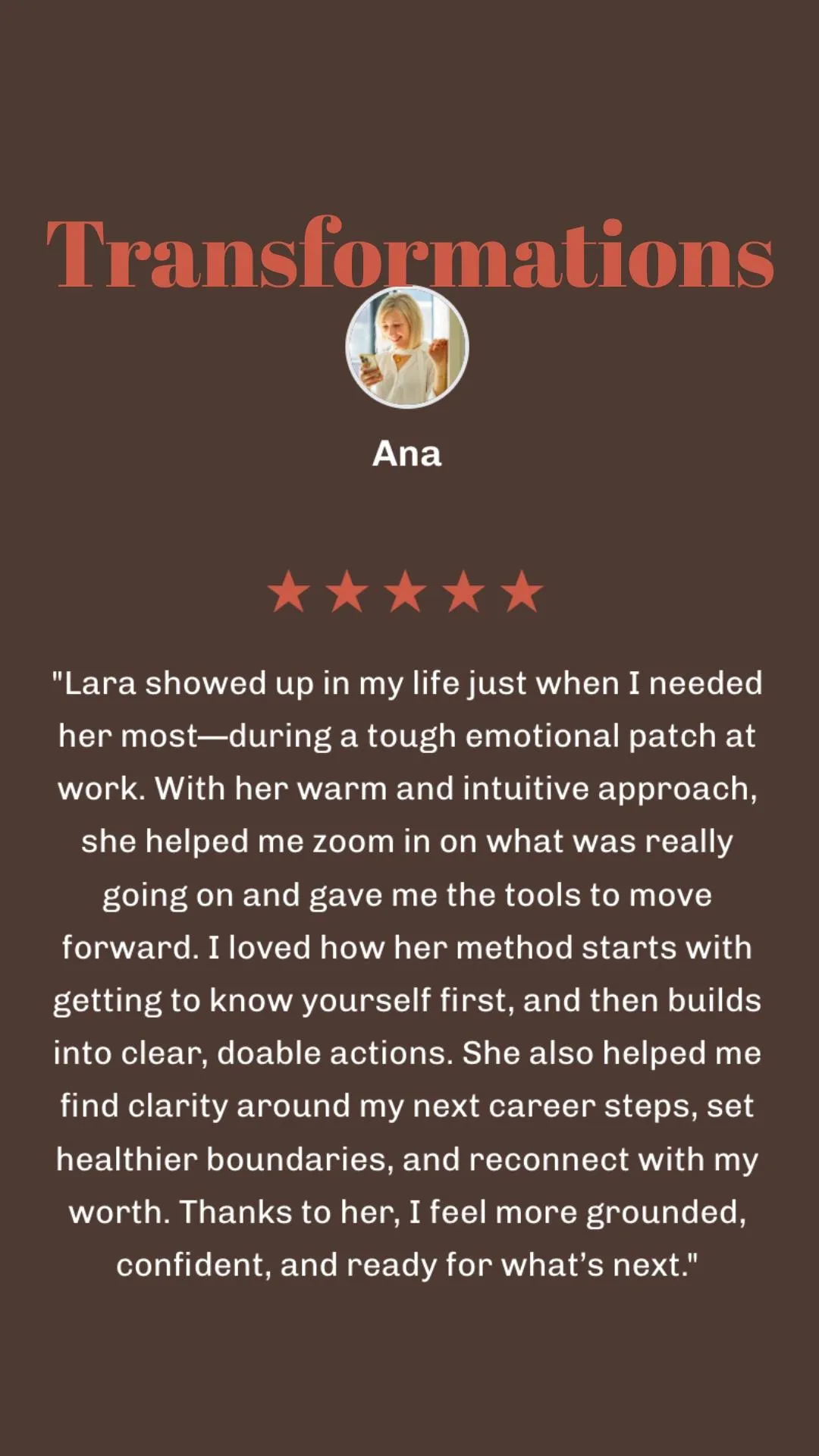 "Lara showed up in my life just when I needed her most—during a tough emotional patch at work. With her warm and intuitive approach, she helped me zoom in on what was really going on and gave me the tools to move forward. I loved how her method starts with getting to know yourself first, and then builds into clear, doable actions. She also helped me find clarity around my next career steps, set healthier boundaries, and reconnect with my worth. Thanks to her, I feel more grounded, confident, and ready for what’s next."
