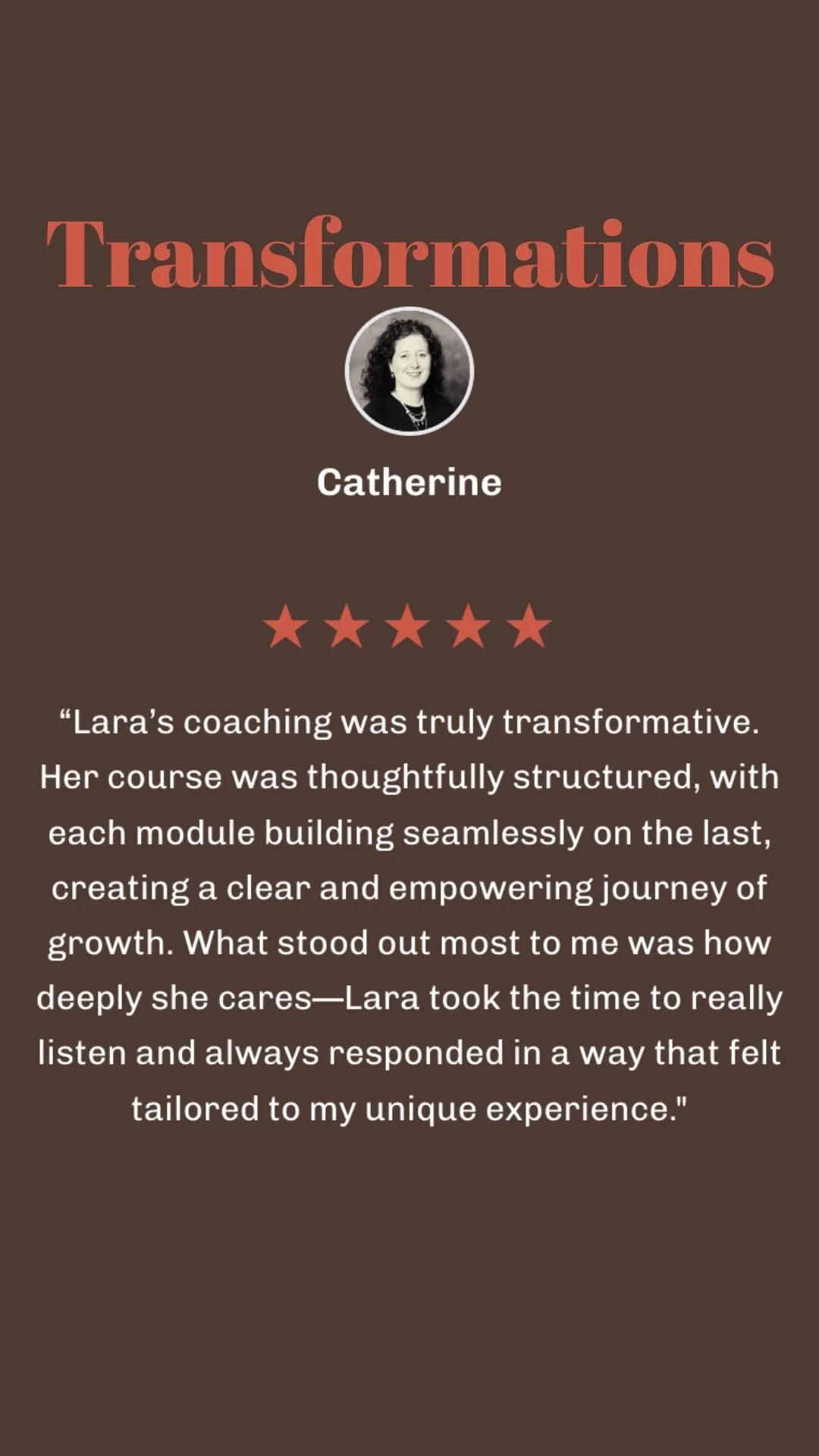 “Lara’s coaching was truly transformative. Her course was thoughtfully structured, with each module building seamlessly on the last, creating a clear and empowering journey of growth. What stood out most to me was how deeply she cares—Lara took the time to really listen and always responded in a way that felt tailored to my unique experience."